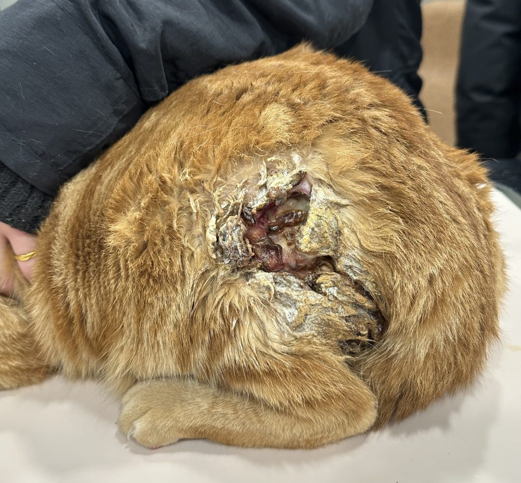 在兩位助理的保定下,我開始逐個區域的檢查傷口,發現在傷口後段的部分皮膚腫腫的,按壓確實能擠出分泌物來,而且分泌物有點膿樣,我還是很難確認到底是不是分泌物在臭,因為整隻貓、甚至整個診間此時都彌漫著一股腐臭味。