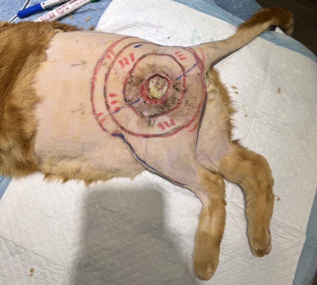 當時的手術是沿團塊邊緣小範圍切除,術後一週傷口就被舔開、之後也沒有癒合。