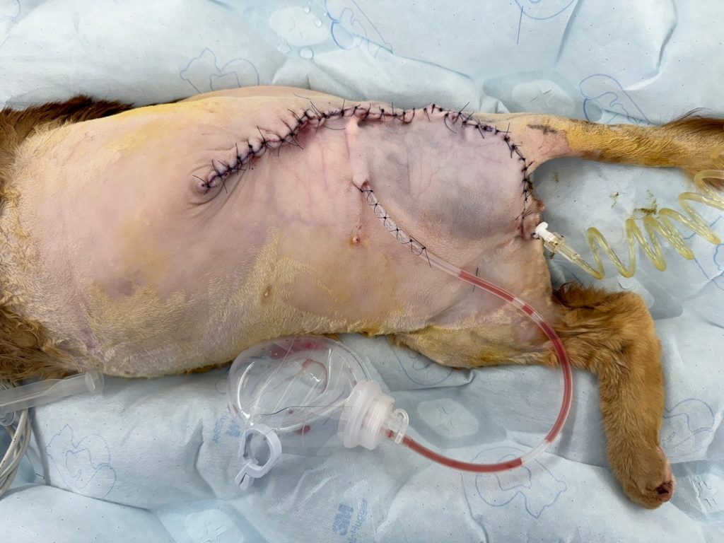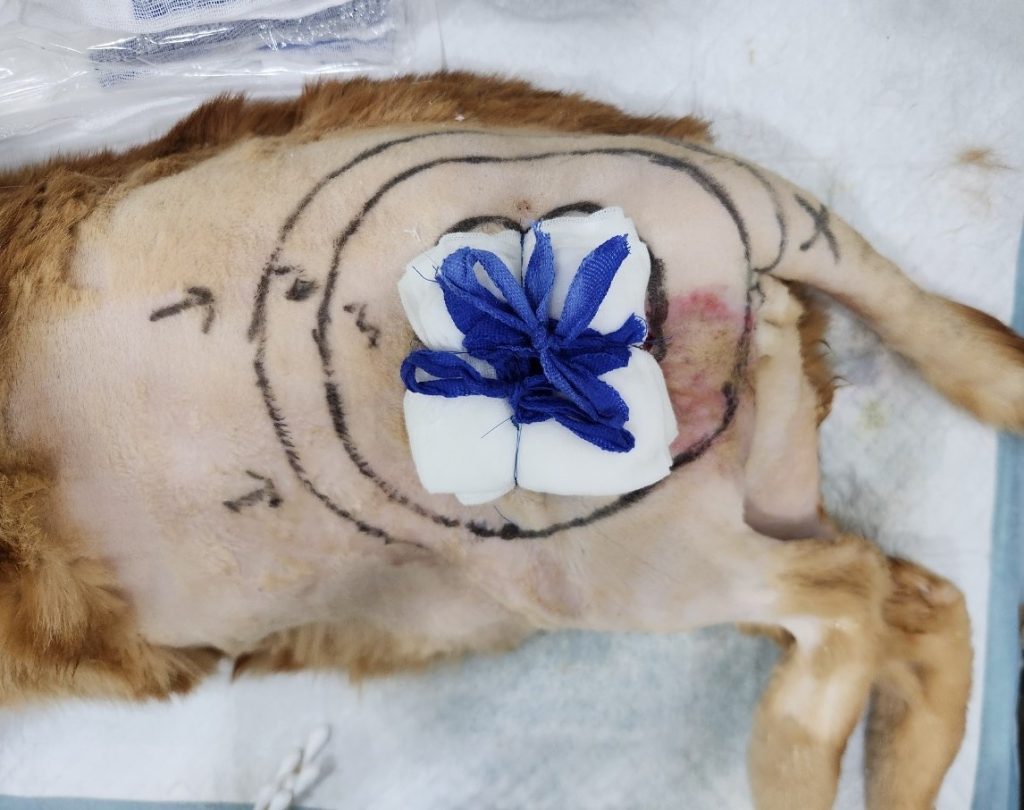 我們將Saba上針後鎮靜,將傷口與整個半側腹壁的毛全部剃光,然後消毒、清創。
