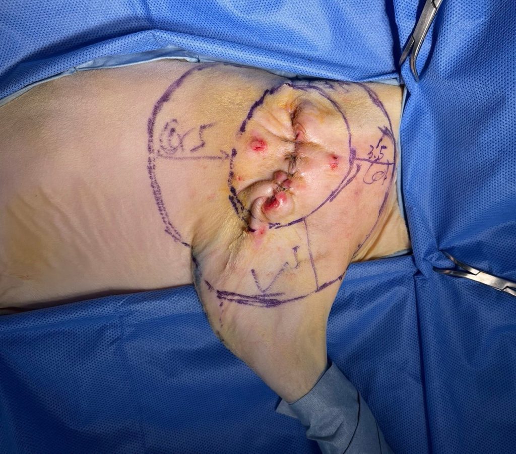 先劃定手術邊界,以腫瘤為圓心畫一個5公分半徑的圓,靠近尾巴、包皮、肛門的區域則畫3.5公分就好。