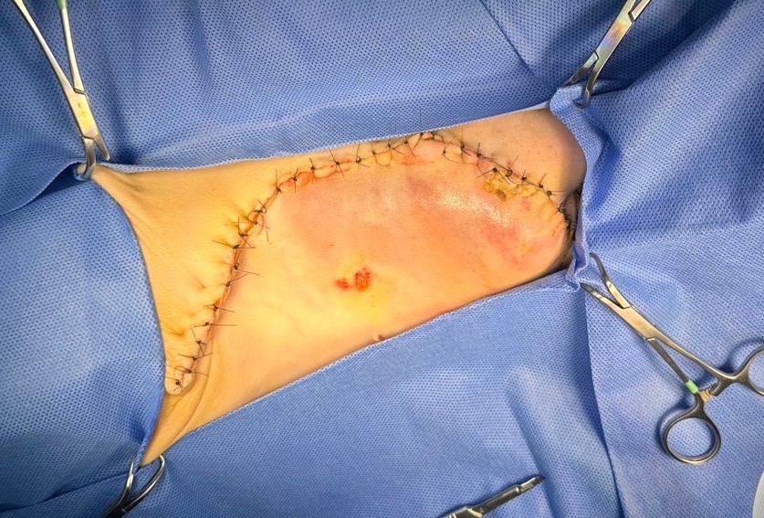 而原本保持開放的傷口區域,紅色健康的肉芽組織已長得十分厚實,代表傷口已經排除感染了,我們將其與皮膚分開,並刮掉一定厚度的肉芽組織,好讓兩邊的皮膚對合。