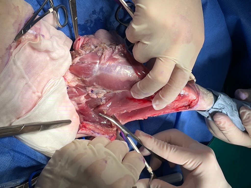 這是最單純的部分,做法如同一般截後肢,我們從鼠蹊皮折往遠端數2公分,將所有肌肉橫斷,以及結紮股動脈靜脈。