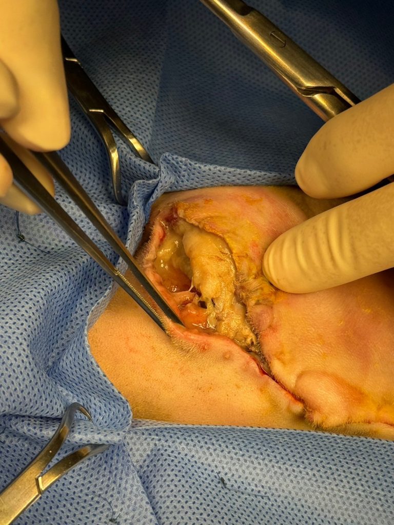 下午,在開放傷口的背側(也就是貓的背側)我們發現有一個空間藏著大量的膿汁,我們將上方的皮膚劃開、讓膿引流出來。