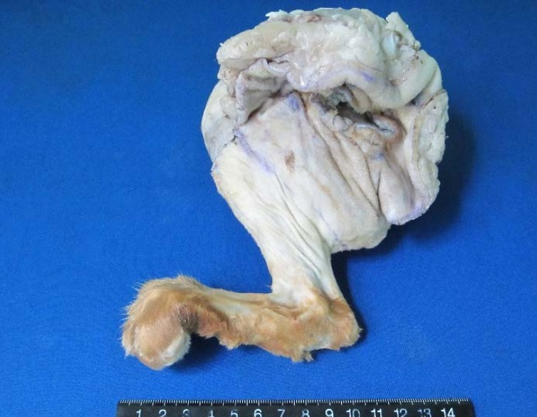 我們特別將大腿內側連接鼠蹊皮折的皮膚、皮下脂肪、和少部分留下的肌肉留下,以幫助關閉腫瘤切除後的巨大創口。至此,腫瘤與左後腳已完全切除。