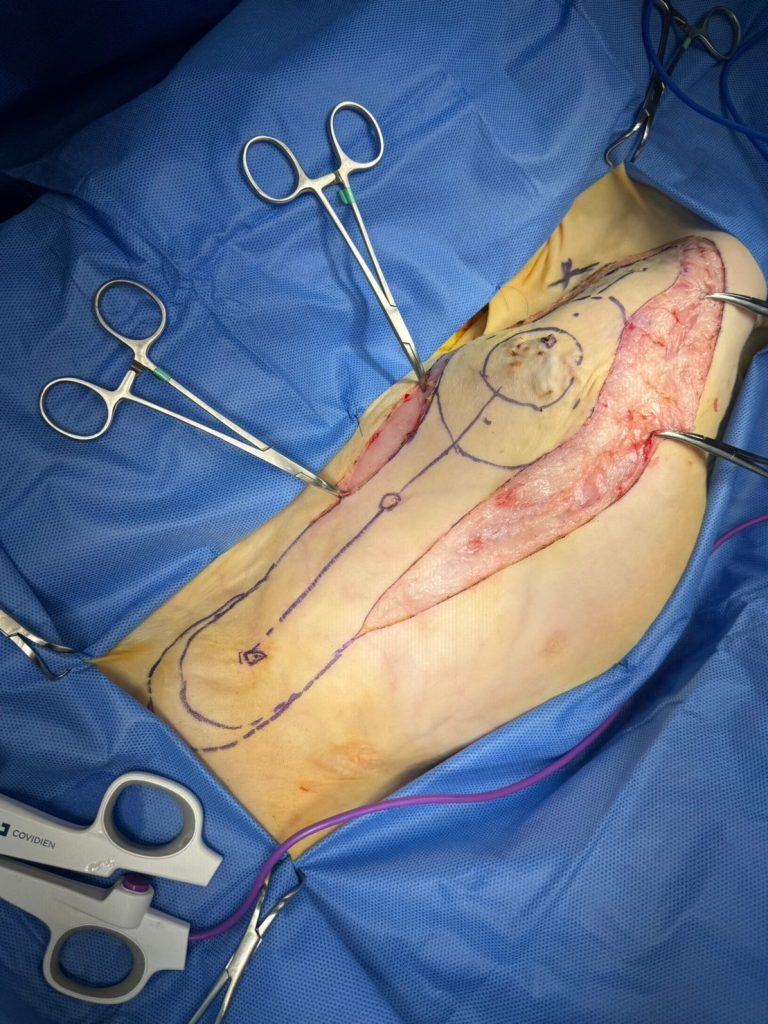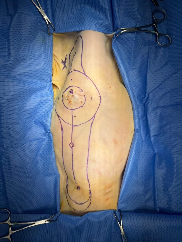 而且從第一次門診見到腫瘤至今,腫瘤浸潤的區域有明顯的擴散,所以我判斷手術切除時,需要在腫瘤區域下最多工夫,我得在右側第二乳頭的腫瘤區,給它一個最寬的安全邊界,這樣才能完整的移除癌細胞、避免日後的復發。