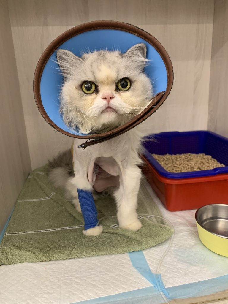 就像照片中那樣,貓貓在手術24小時後,就恢復了原本的活力,眼神明亮明亮的樣子,在籠子內走來走去,看起來很想回家的樣子,食慾也都很穩定(打開籠子還會討摸摸,簡直可愛到一個不行)。