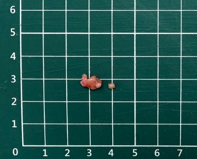 這麼小的團塊們,細針採樣是行不通的,和家人討論後,我們決定讓貓咪鎮靜,然後以皮膚採樣器採樣這個區域,採樣完再以縫線關閉採樣創口,順便當作記號,以免採樣後團塊不好摸到,造成手術難以判定範圍。